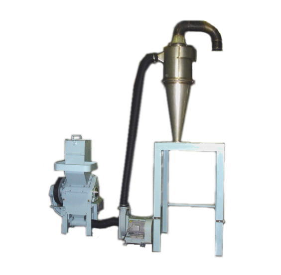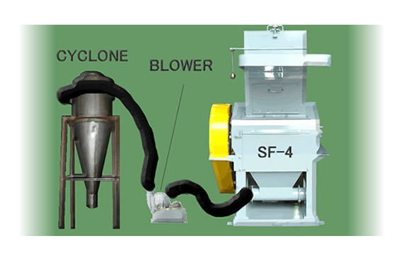 粉砕機で粉砕された品物を、ブロワーで吸引して、サイクロンで回収できるシステムです。粉砕物の回収が容易になり、粉砕効率が良くなります。